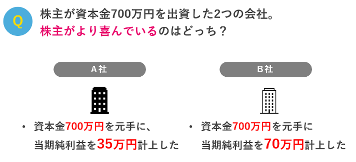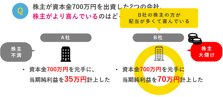 すると、A社よりB社の株主の方が、同じ資本金を出したのに、当期純利益・配当が多くて喜んでいると考えられます。