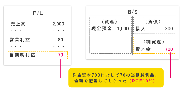 この場合、株主が会社に700万円を預けたら1年間で70万円、10%の金利が付いたといえます。この金利をROEと呼ぶわけです。