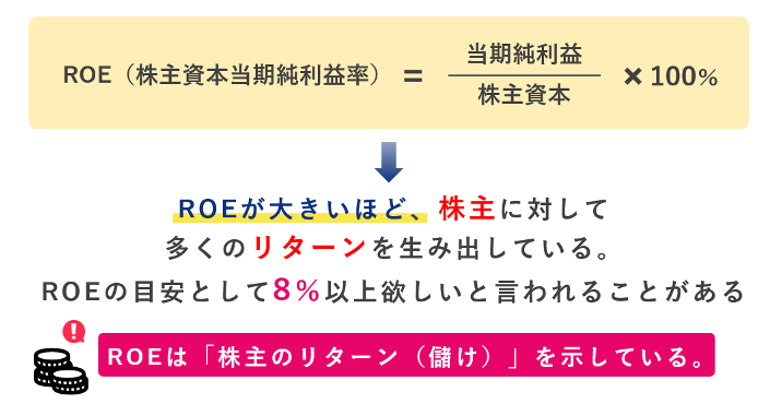 以上の通り、ROEは「株主のリターン」を示しており、これが大きいほど、株主は満足しているというわけです。